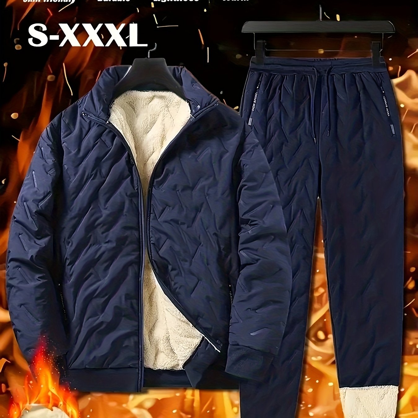 TEMU 남성 캐주얼 투피스 세트: 두꺼운 기모 안감 재킷 및 바지, 고품질 겨울 스포츠 지퍼업 후드티, 드로스트링 포켓이 있는 탄성 허리 밴드, 단색 다용도 홈 아웃도어 스키용 방풍 보온 플러시 복합 보온 속옷 상의