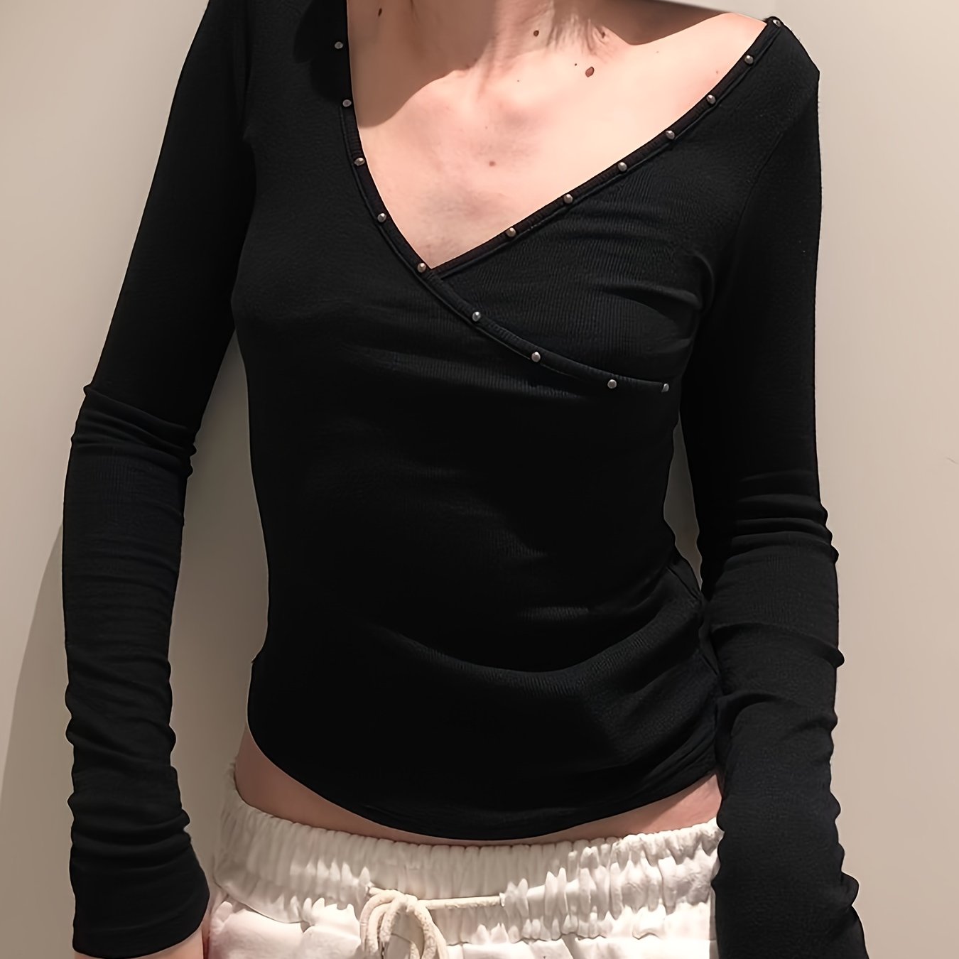 TEMU 여성용 슬림핏 크로스오버 V넥 긴팔 티셔츠 - 솔리드 컬러 베이스 V-림블라인드 디자인, 미디엄 스트레치 레이어링 탑, 봄/가을용, 오피스에서 세미포멀 웨어까지, 세탁기 사용 가능 - 다용도 블라우스|셔츠