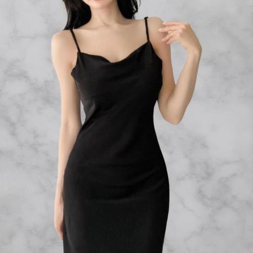 [다잇템]여성 아이보리 롱 새틴 슬림핏 검정 드레스
