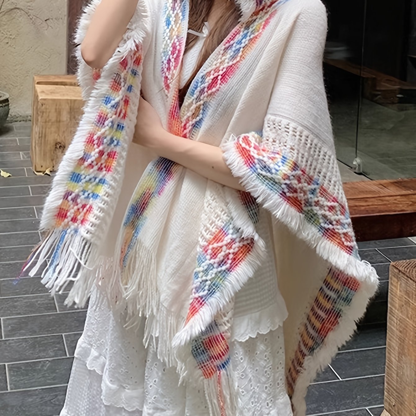 TEMU 여성용 후드 숄, 홀아웃 프린지 케이프 코트, 에스닉 스타일 컬러 블록 후드 여행용 숄, 루즈핏 케이프, 독특한 디자인 니치 후드 프린지 숄, 후드가 있는 아우터웨어 에스닉 스타일 케이프 코트, 여성용 홀아웃 프린지 숄