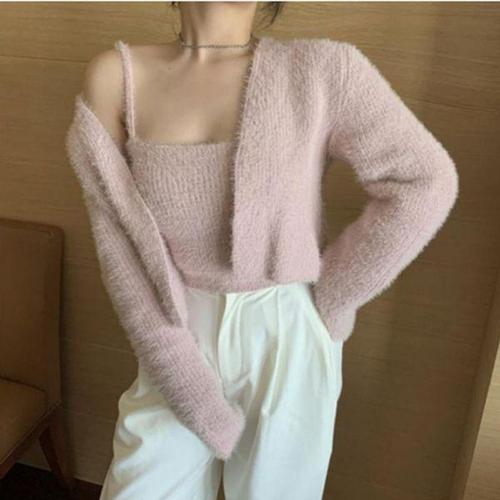 [BZJL6NE3_4C]나시 앙고라 가디건 세트 여성 데일리 크롭