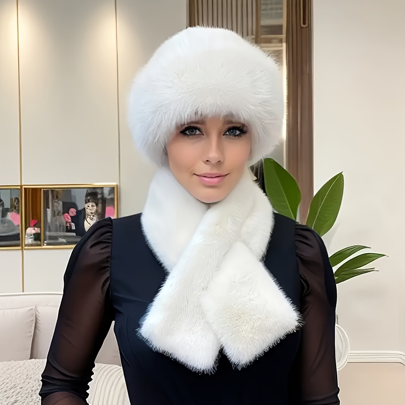 TEMU 여성용 겨울 따뜻한 플러시 투피스 세트, 부드러운 인조 퍼 스카프와 패션 모자 콤보, 보온, 코지, 방풍, 두꺼운 소재