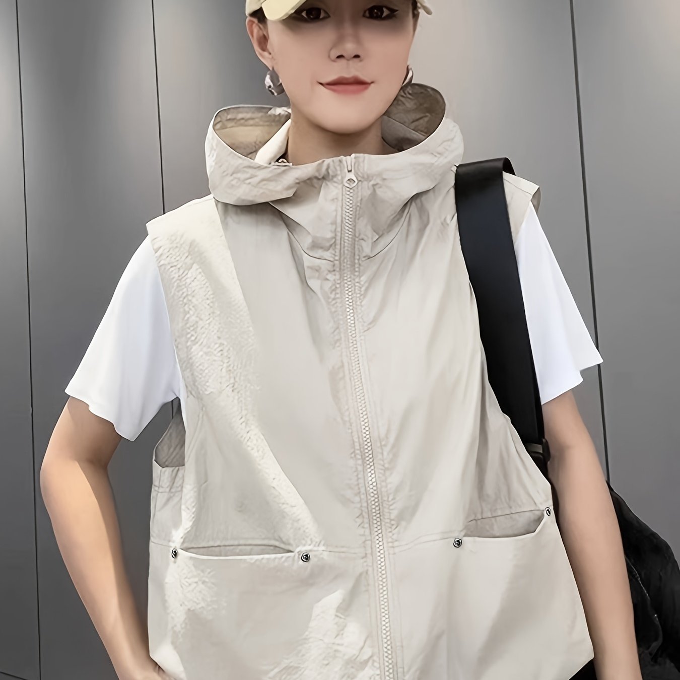 TEMU 여성용 캐주얼 가벼운 솔리드 컬러 후드 지퍼 조끼 (듀얼 포켓)