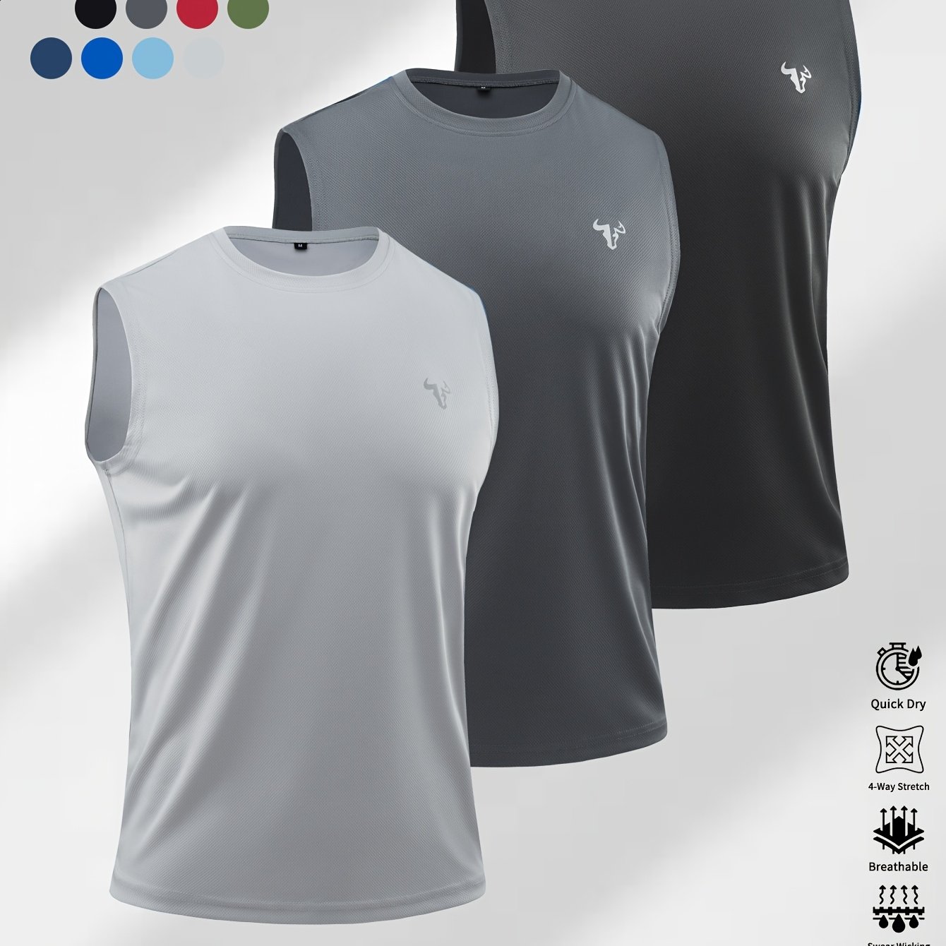 TEMU 3개 세트 남성용 야외 캐주얼 반팔 조끼 - 반사 황소 엠블럼 디자인, 통기성 빠른 건조 폴리에스터 니트 (등산, 러닝, 사이클링, 낚시, 농구) - 가벼운 봄/여름/가을 액티브웨어, 라운드넥 베스트, 기계 세탁 가능, 스포티한 스타일, 내구성 강화, 피트니스 애호가를 위한 스포츠 웨어