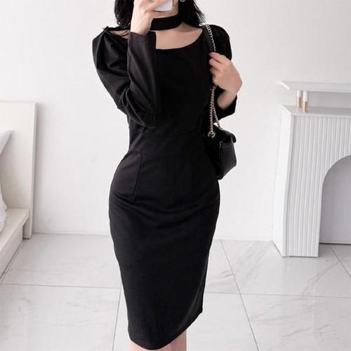 [신상오픈런]어깨견장 폴라 보트넥 슬림 검정색 긴팔 저지원피스
