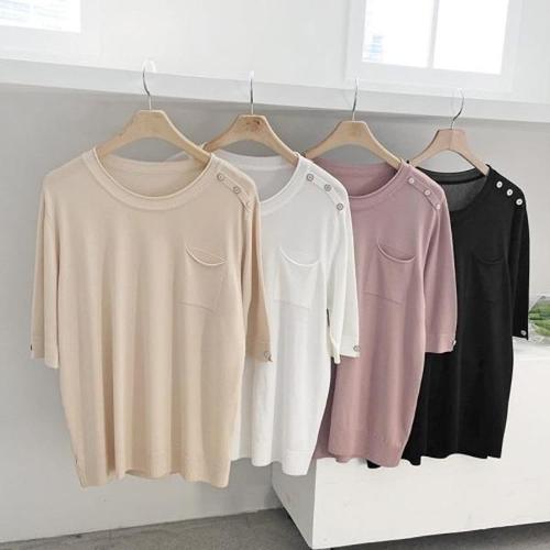 [옷자락]여자 어깨견장 라운드넥 출근룩 무지반팔 포켓 니트