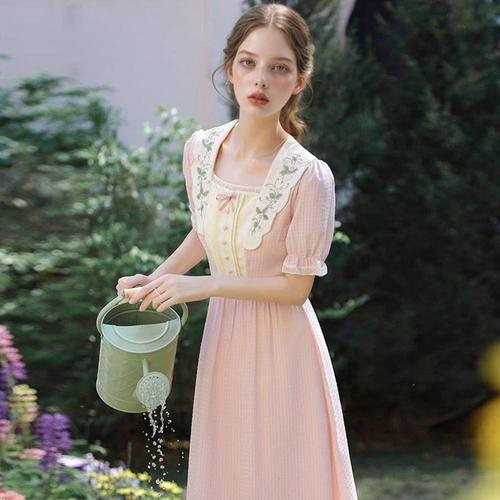 [교복몰]베이비핑크 날개카라 플라워자수 원피스 경성의상