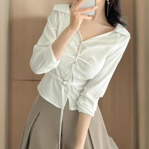 [신상오픈런]여성 클래식 브이넥 벨트 긴팔 셔츠
