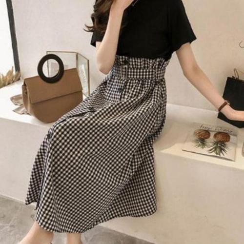 [신상오픈런]여성 단색 반팔 티셔츠 벨트 A라인 치마 투피스 세트