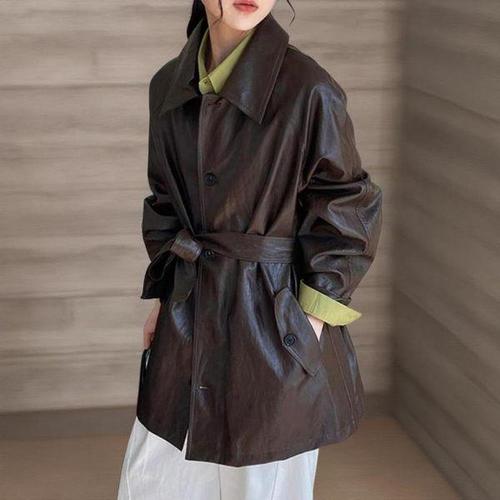 [신상오픈런]여성 키치 스타일 가죽 벨트 하프 코트 배색 안감