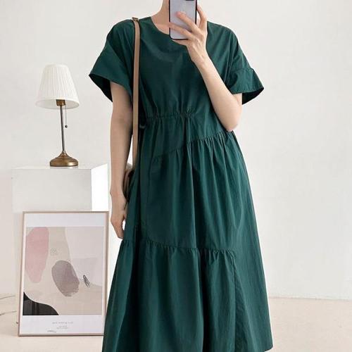 여성 반팔 허리밴딩 롱 원피스