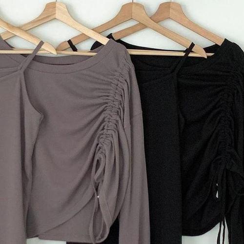 GSS ET602 여자 언밸런스 골지 셔링 블랙 티셔츠