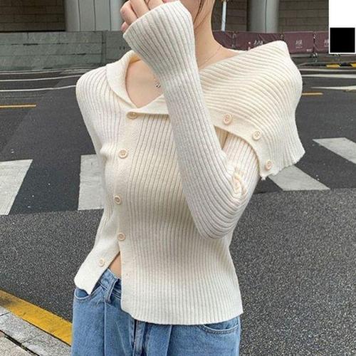 [에이치플러스몰]라운드넥 니트 긴팔 티셔츠 언발란스 옆절개 단추