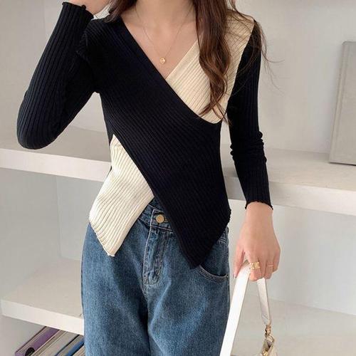 [에이치플러스몰]여자 배색 언밸런스 트렌드 브이넥 니트티 데일리 봄