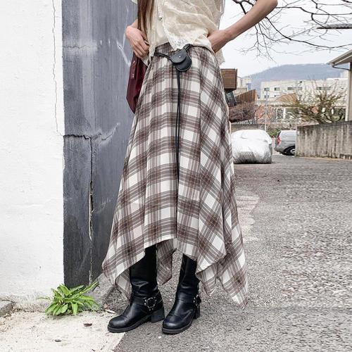 [다잇템]여자 격자 롱 일상룩 치마 혁대 언발 세트