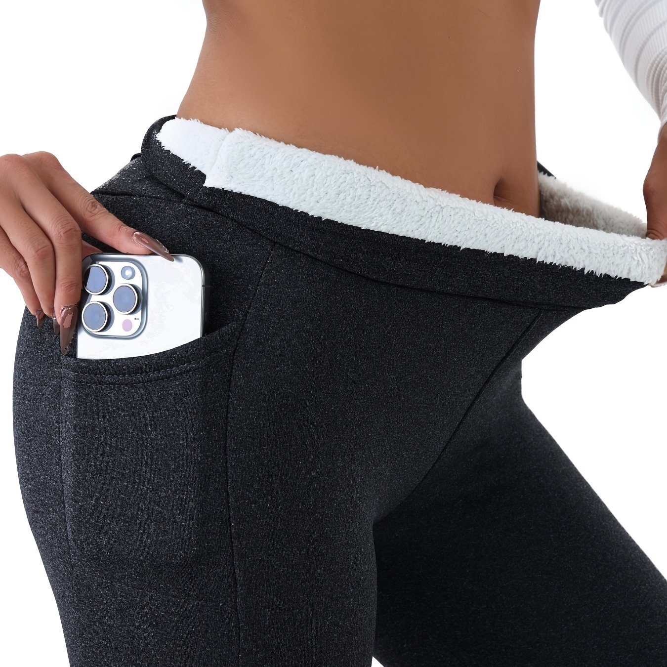 TEMU 여성용 포켓이 있는 따뜻하고 편안한 플리스 레깅스 | 높은 탄성, 긴 기장, 단색, 가을/겨울에 적합, 패셔너블한 홈웨어 및 아웃도어 웨어