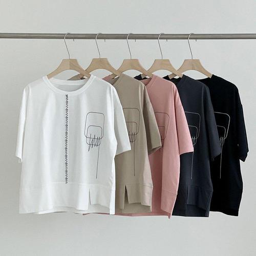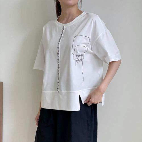 [옷자락]여성 자수 스티치 언발 컷팅 라운드 엉덩이커버 티셔츠