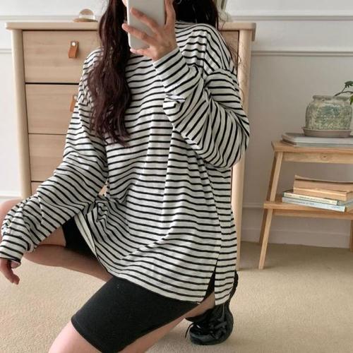 [옷자락]여자 줄무늬 트임 단가라 엉덩이기장 빅사이즈 티셔츠