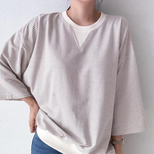 [옷자락]여자 오버핏반팔 칠부 줄무늬 엉덩이커버 콘트라스트 티셔츠
