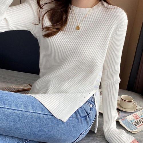 라운드넥 옆단추 언발 절개 엉덩이 기장 니트 티셔츠 WD4BEC0