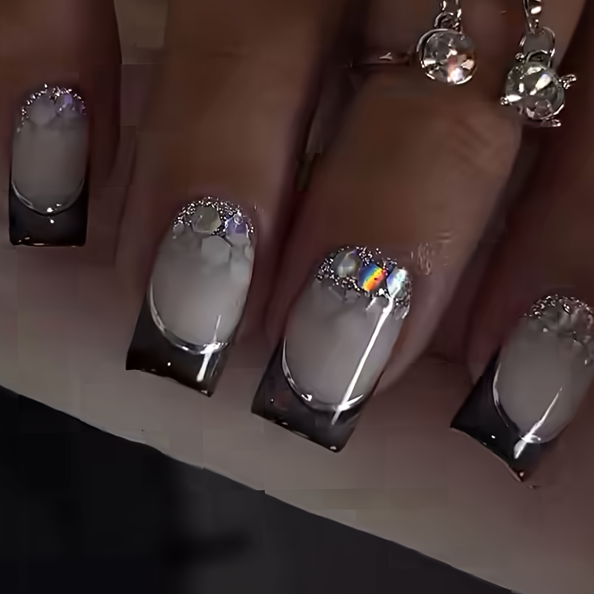 TEMU 24개 세트 패셔너블 비즈니스 캐주얼 우아한 데일리 모던 유럽풍 블랙 프렌치 스타일 실버 라인 글리터 미디엄 스퀘어 인조 네일 세트, 여성을 위한 스타일 즉각 업그레이드