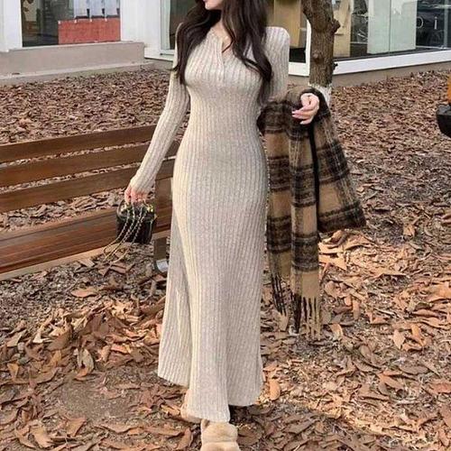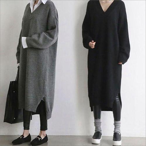 [에이치플러스몰]여성 겨울 데일리 v넥 니트 롱원피스 루즈핏 울혼방 원피스