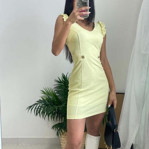[다잇템]여자 옐로우 프릴 민소매 브이넥 미니원피스