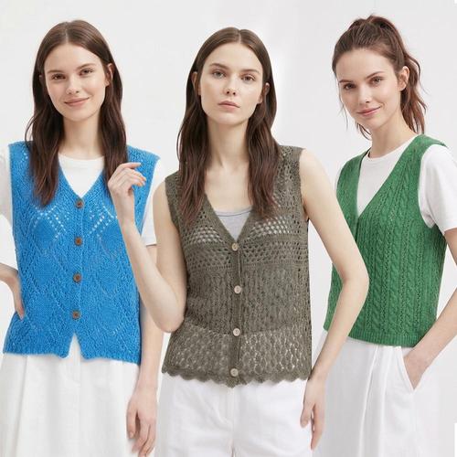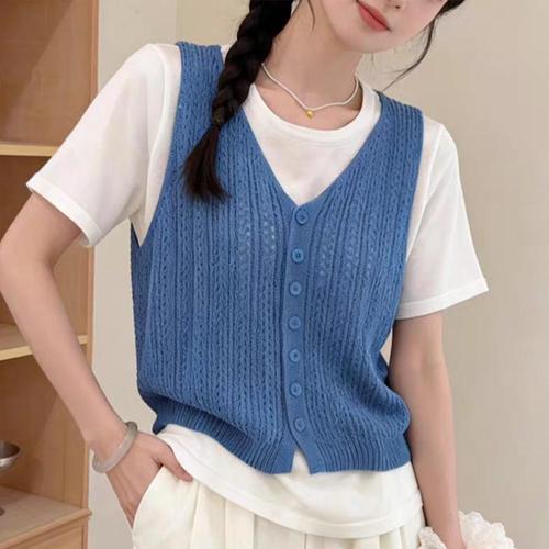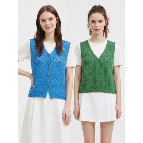 [샵앤] 여성 Y오픈 단추 펀칭 레이어드 여름 니트 조끼 21DS-WVS-5215