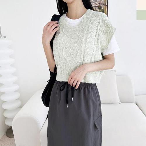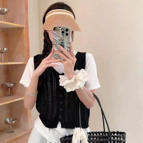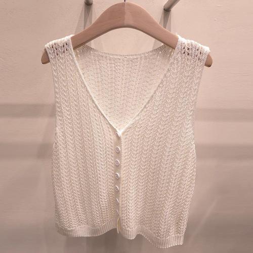 여자 펀칭 니트 조끼 여름 브이넥 민소매 베스트 크롭