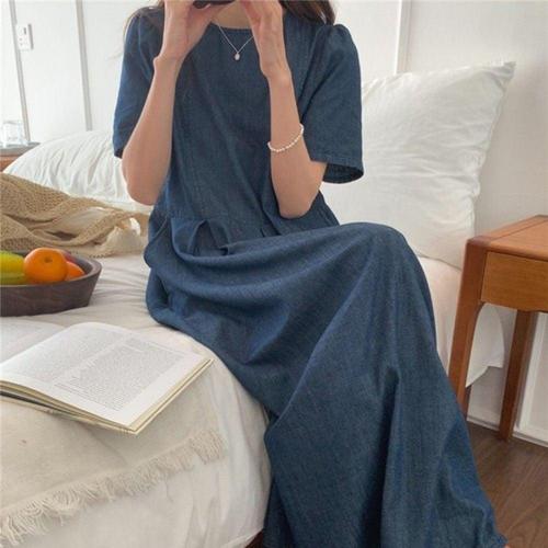 여성용 데님 반팔 롱 원피스 캐주얼웨어 여름 의류 WFLIOKL