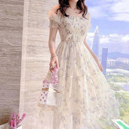 [에이치플러스몰]여름 쉬폰 플라워 반팔 편한 여성 롱 원피스 바캉스