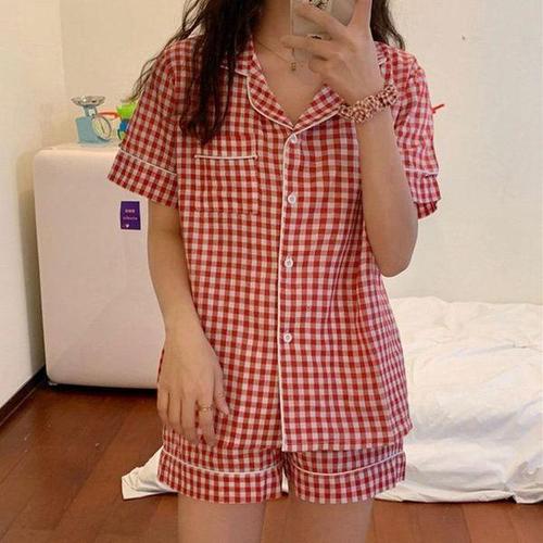 [셀러허브_여성트랜드패션]ONM 여름 홈웨어 체크 파자마 귀여운 잠옷 세트