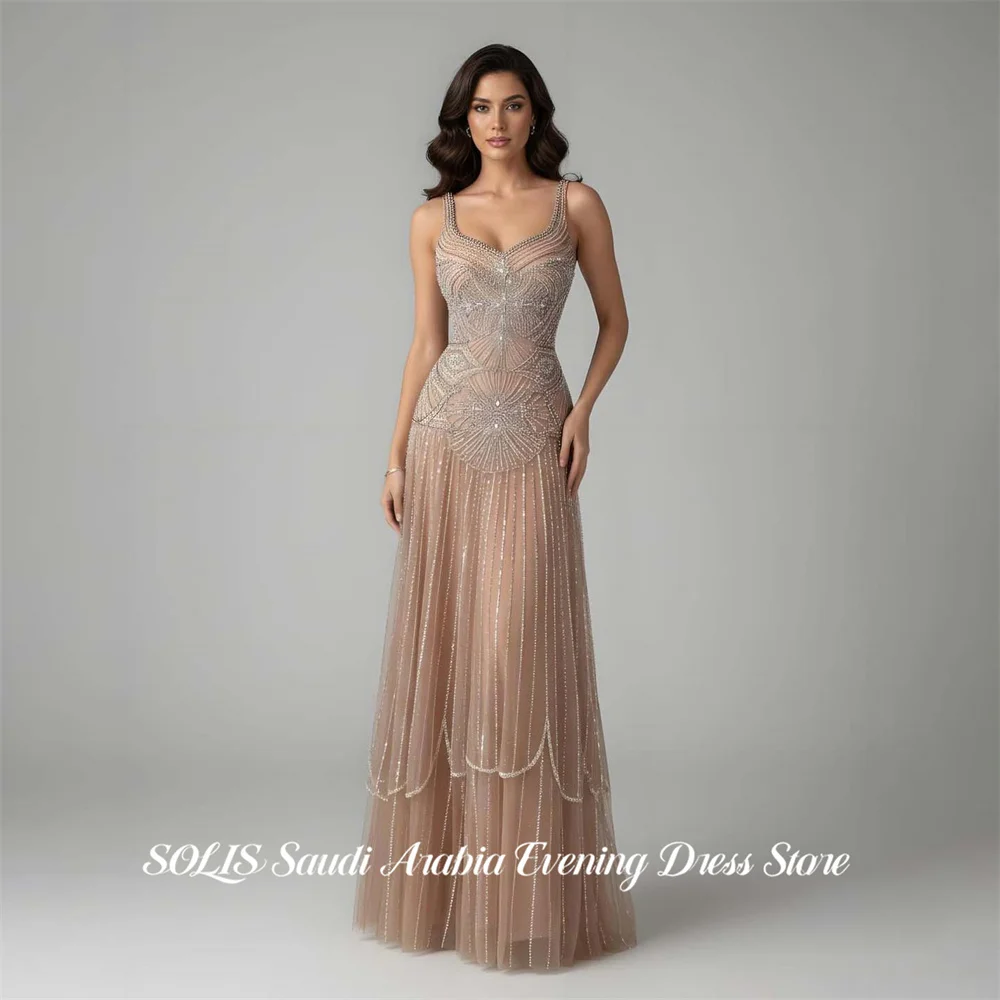 럭셔리 샴페인 튤 이브닝 드레스 클래식 스위트하트 민소매 연예인 가운 섬세한 크리스탈 맞춤형 파티 드레스