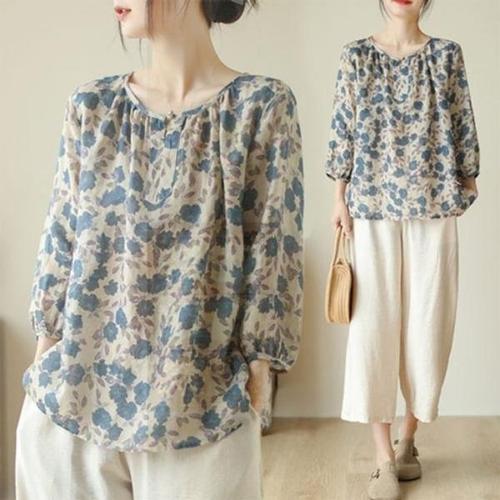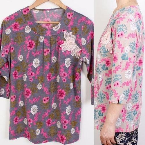 [쉐르담]라운드 여름 프린트 패턴 칠부 블라우스 CI2-671BL