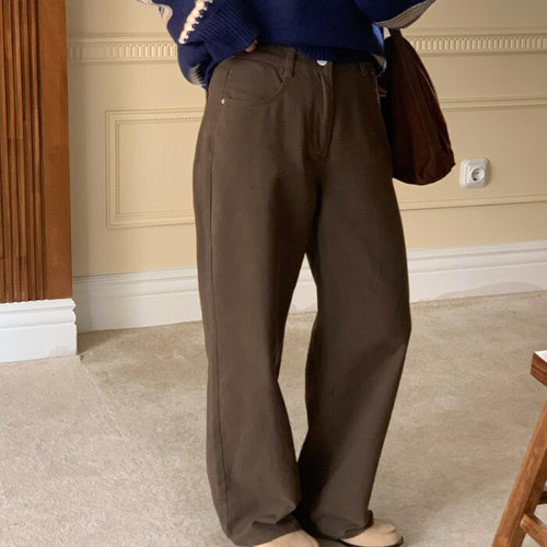 Ashysnow 기모 도톰 일자 데님 팬츠 여 가을 겨울 캐주얼 와이드 면 밴딩 허리 와이드 팬츠