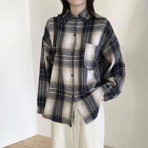 [신상오픈런]여성 체크 패턴 오버사이즈 기모 긴팔 셔츠