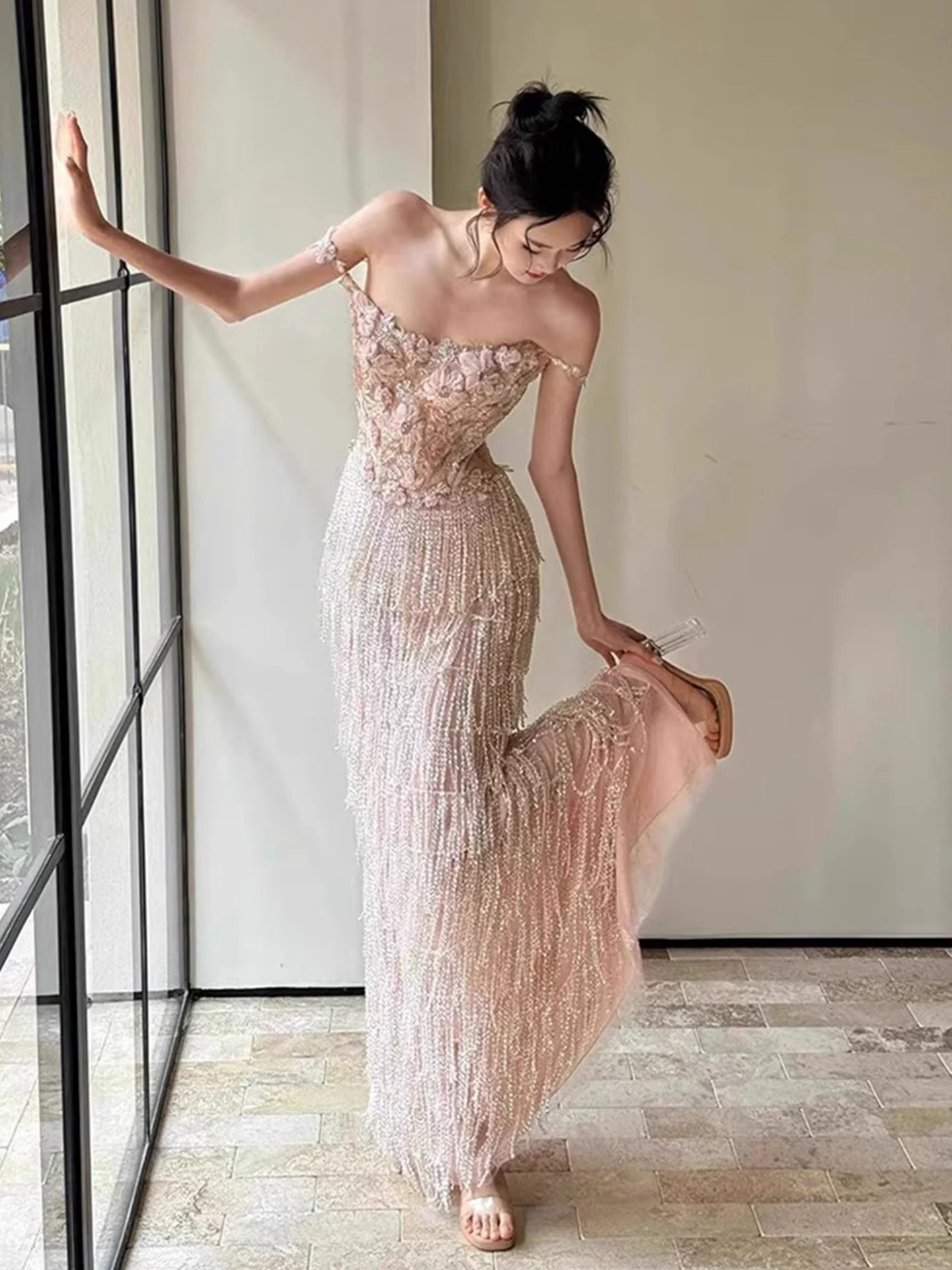 화려한 장식의 모닝 로브 웨딩 드레스 이브닝 가운 여성용 진주 장식 중간 허리 롱 스커트 한국 스타일