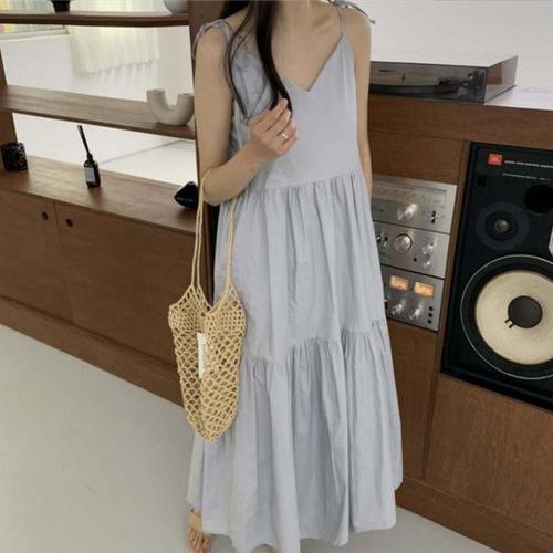 미중 여성 여름 뉴 벨벳 누름 주름 무지 패션 브이넥 민소매 기질 A라인 박시 롱원피스 xyy