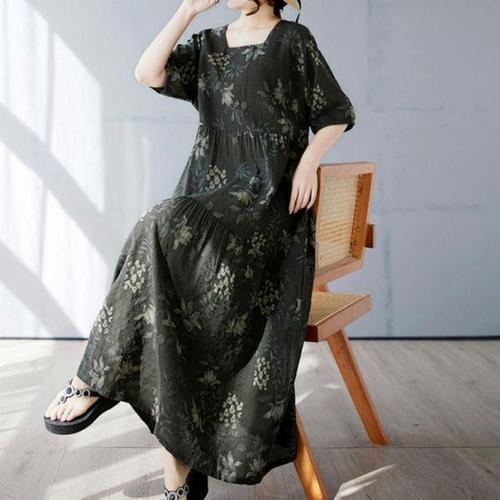 [에이치플러스몰]여성 여름 반팔 스퀘어넥 루즈핏 린넨 프린트 롱 원피스