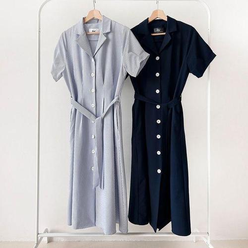 [미라클세븐]여성 스트라이프 카라 리본 벨트 핀턱 롱 드레스