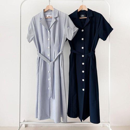 [신상오픈런]여성 스트라이프 카라 리본 벨트 핀턱 롱 드레스 휴양지용