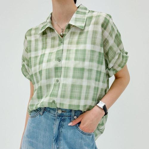 [신상오픈런]여성 체크 시스루 반팔 블라우스 린넨 여름 셔츠