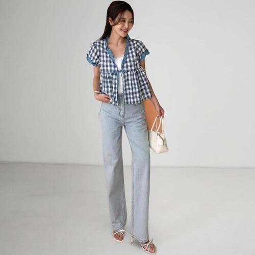 [옷자락]여자 셔링반팔 시스루 여름블라우스 체크 린넨 셔츠