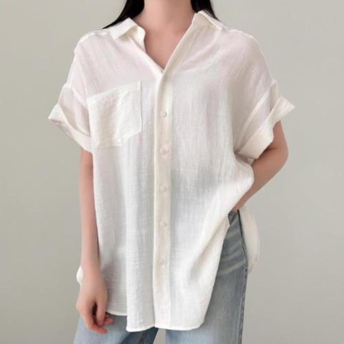 |CCH3FF7|여성용 린넨 레이온 오버핏 반팔 셔츠 포켓 스타일