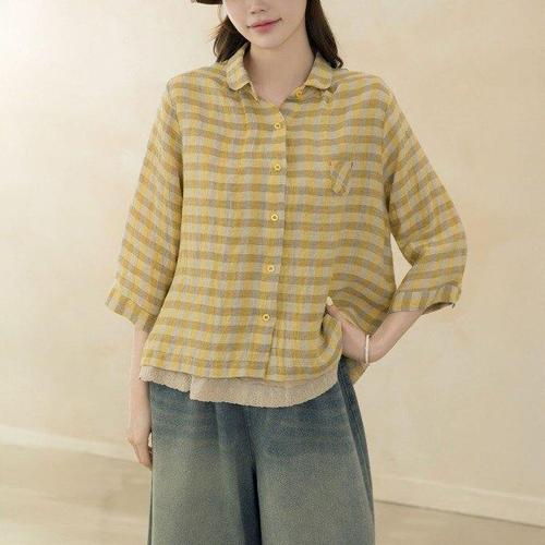 AOKADA 여성 린넨 셔츠 블라우스 솔리드 루즈핏 5부소매 여름 엄마옷 중년 여자 남방 상의
