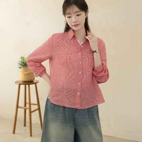 [디얼마미]체크 셔링 린넨 카라 남방 /마담 미시 중년 여성 빅사이즈 40대 50대
