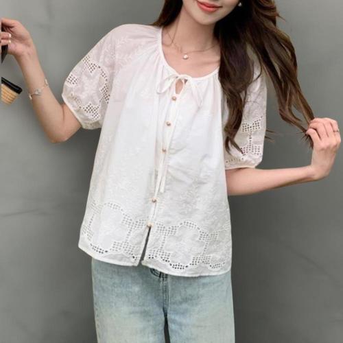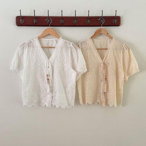 여자 반소매 펀칭 꽃자수 크림색 리본 블라우스