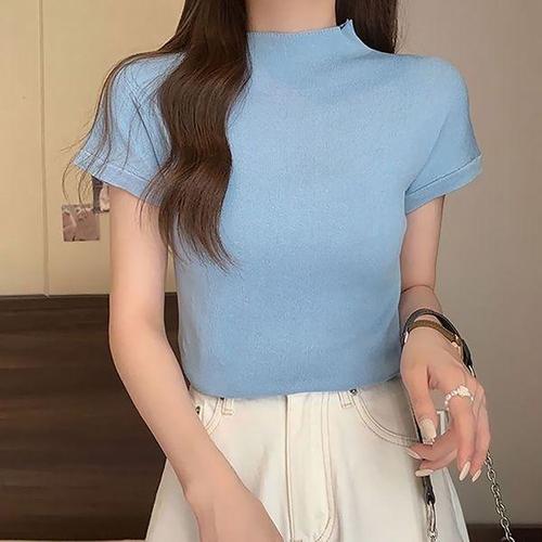[에이치플러스몰]여성 반팔 하이넥 니트탑 여름 데일리 슬림핏 하프티