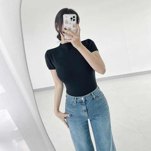글램핏 / 페미닌 반폴라 셔링 퍼프 슬림핏 이너 반팔 니트 티셔츠 가을 겨울 3컬러
