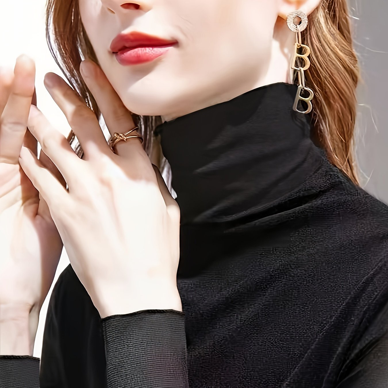 TEMU 여성용 폴리에스터 긴팔 하이넥 티셔츠, 우아하고 세련되고, 기계 세탁 가능, 가을과 겨울 패션